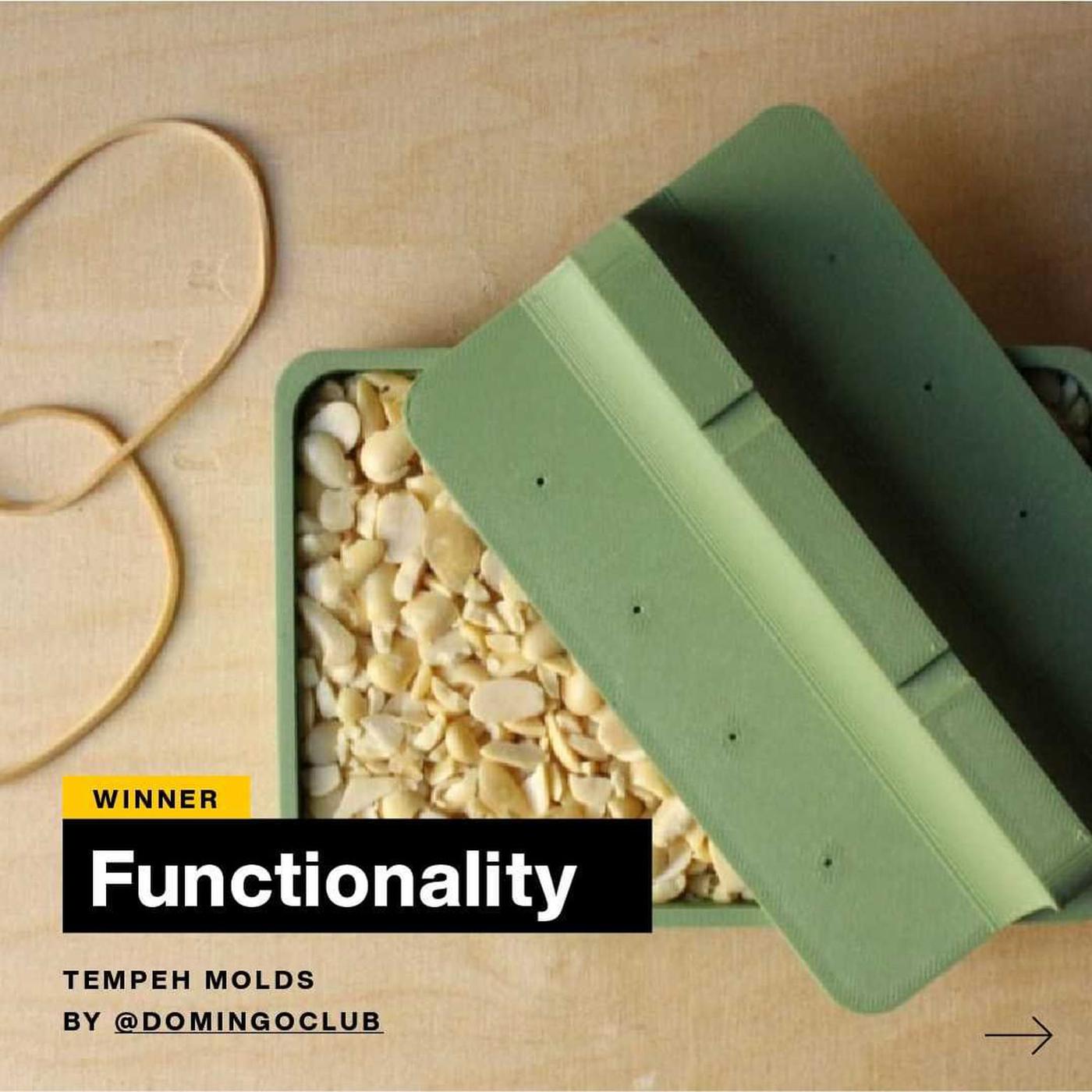 We entered our 3D printed tempeh moulds in an innovation challenge organised by WikiFactory and won the prize for best functionality. The judges said "Clever, simple, insightful and functional. Really the best design for easy manufacturability".